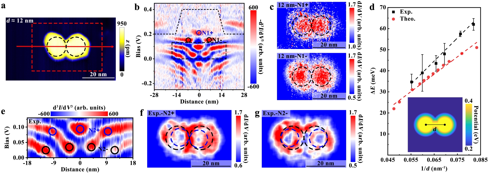 图2 a. 两个耦合量子点的STM形貌图。b. 沿图a中红色箭头方向的STS谱线随距离的变化图。c. 图b中N1+和N1-所对应能量的实空间电子态分布。d. N1+和N1-的能量间距随两个量子点之间距离倒数的变化关系。e. 图b中黑色虚线矩形框的放大图。f-g. 图e中N2+和N2-所对应能量的实空间电子态分布。