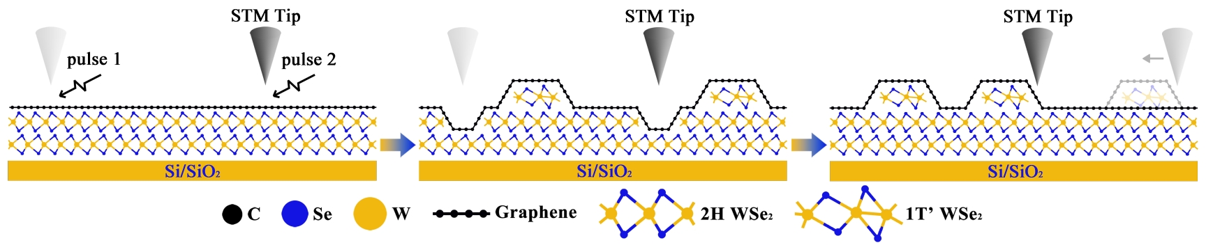 在自然界中,当两个相同的原子相距较远时,它们保持孤立的原子状态;当二者距离较近时,它们可以结合形成分子。从原子耦合到分子这一过程非常迅速,这使得控制原子间距研究从原子到分子的演化过程异常困难。早期对传统半导体量子点的研究中,研究人员发现量子点可以被当作人造原子:量子点可以将电子限制在离散的能级上,类似于原子中原子核限制核外电子[1]。因此,当两个量子点彼此靠近时,它们各自的能级可以线性耦合,形成类似于分子中的成键态和反键态。基于此,两个耦合的量子点也被称为人工分子[2]。这些结果意味着量子点为模拟分子物理提供了一个独特的平台。近年来,研究人员发展了许多方法来构筑传统半导体量子点,并对其准粒子的受限进行了深入研究,实现了从人工原子到人工分子的转变[3,4],但对这一演化过程的系统实验研究还未开展,对于具有相对论性的人工原子到人工分子的演化规律研究更是缺失。最近,楼凤 何林教授课题组和北京大学的孙庆丰教授课题组合作,通过扫描隧道显微镜(STM)的针尖操纵技术,实现了在纳米级精度上连续调节两个石墨烯/硒化钨异质结量子点(GQDs)之间的距离,从而系统的研究了从相对论性人工原子到相对论性人工分子的耦合过程[5]。