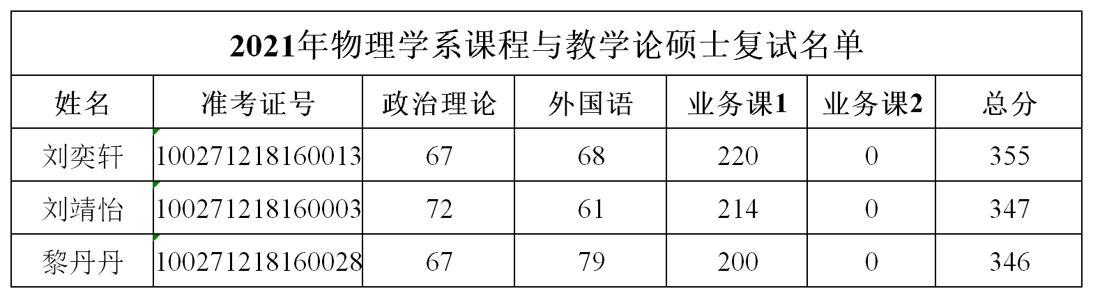 2021年物理学系课程与教学论硕士复试名单